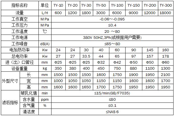 TY系列脫大水透平油專用真空濾油機參數(shù):
