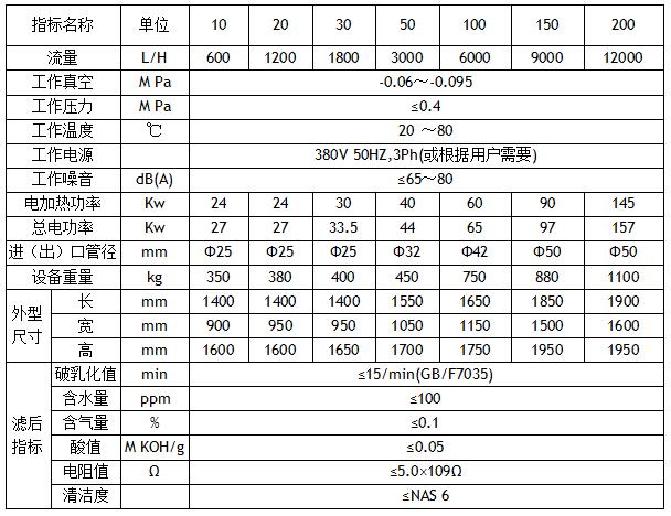 K系列抗燃油真空濾油機(jī)參數(shù):
